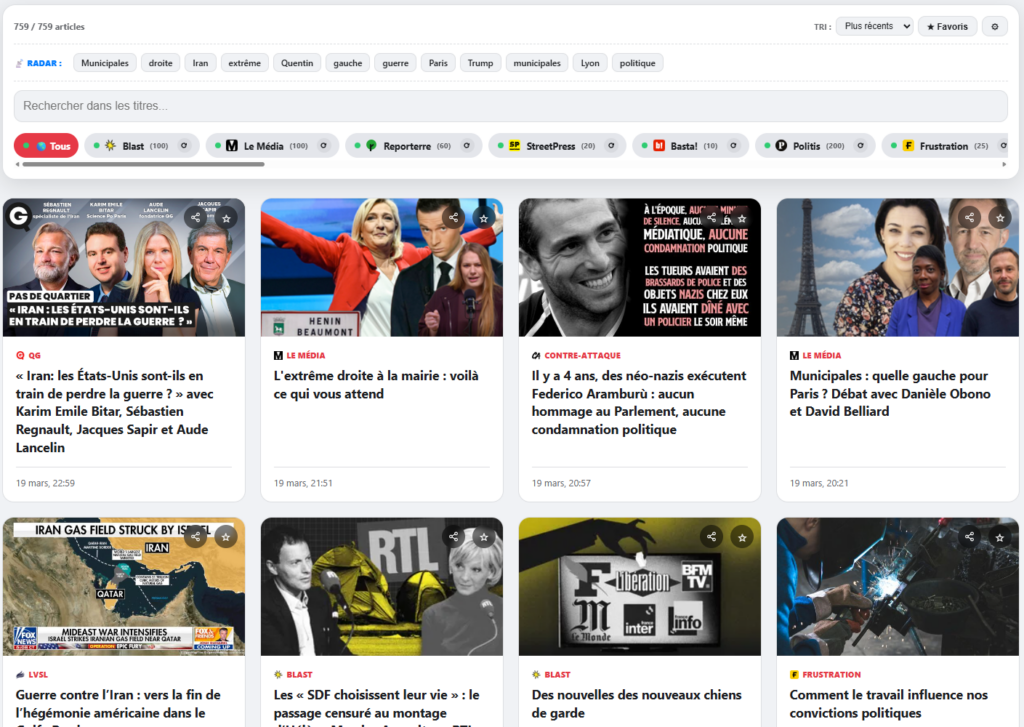 Le Radar est une fonctionnalité que j’aime particulièrement : il analyse automatiquement les titres de tous les articles chargés et en extrait les mots-clés dominants du moment. En un coup d’œil, vous savez de quoi parle l’actualité indépendante aujourd’hui — sans qu’un algorithme ait décidé pour vous.